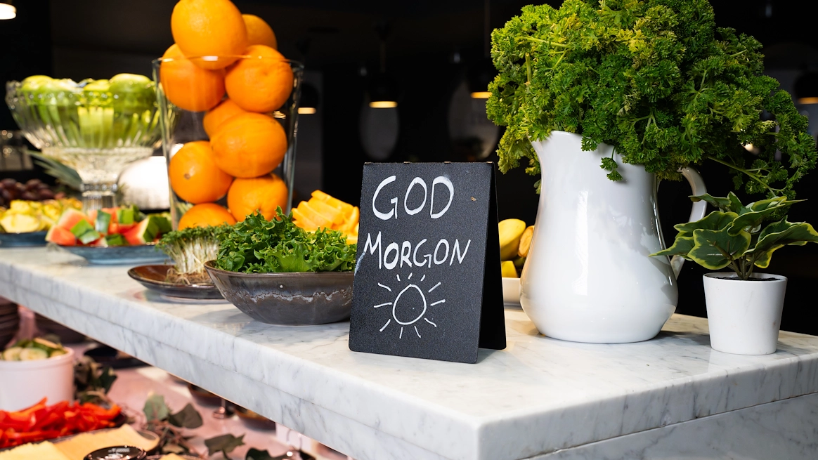 Enkel och avskalad frukostmatsal där själva frukosten står i fokus.